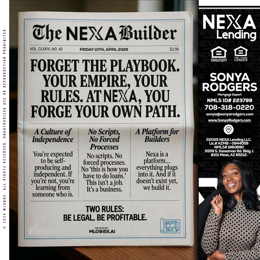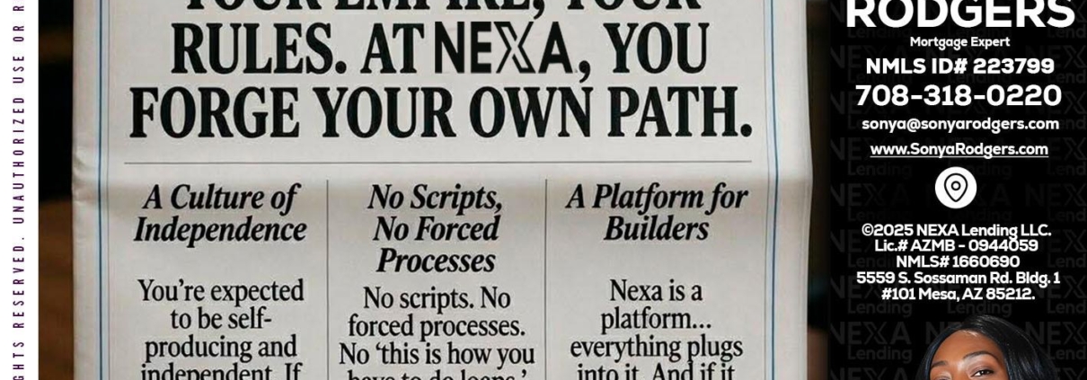 Hi, my name is Sonya Rodgers. I’m a Loan Officer with NEXA Lending LLC., offering personalized mortgage solutions, fast customized quotes, great rates and service with integrity.